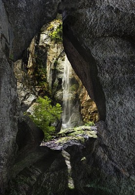 Virginie Otth a placé devant les fenêtres du grand patio des images de grottes et de points d’eau où pousse une végétation humide. On voit des cailloux, des rochers, une rivière, une grotte, des arbres, de la mousse. Ce sont des coins de nature assez sauvages photographiés ici sans présence humaine.