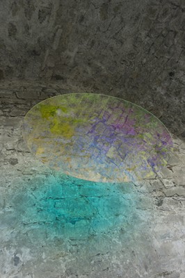 - d’un ovale en verre acrylique de 180 x 120 cm suspendu par deux filins de métal monté d'un filtre dichroïque