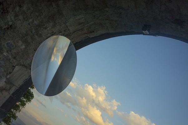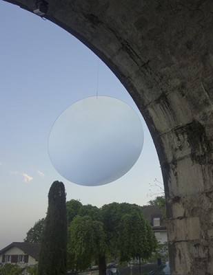 - d’une lentille/loupe en verre ou en verre acrylique de 90x 90cm. également suspendue par un filin de métal, cette pièce tourne légèrement sur elle-même