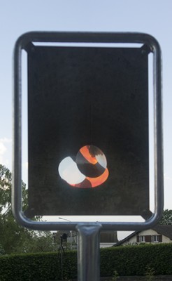 Ce mobile est composé d’objets réflexifs, littéralement, d’objets qui transforment, reflètent, color- ent l’espace qui l’entoure. Des objets qui proposent une image, une image qui bouge légèrement, des images qui tournent sur elles-mêmes.