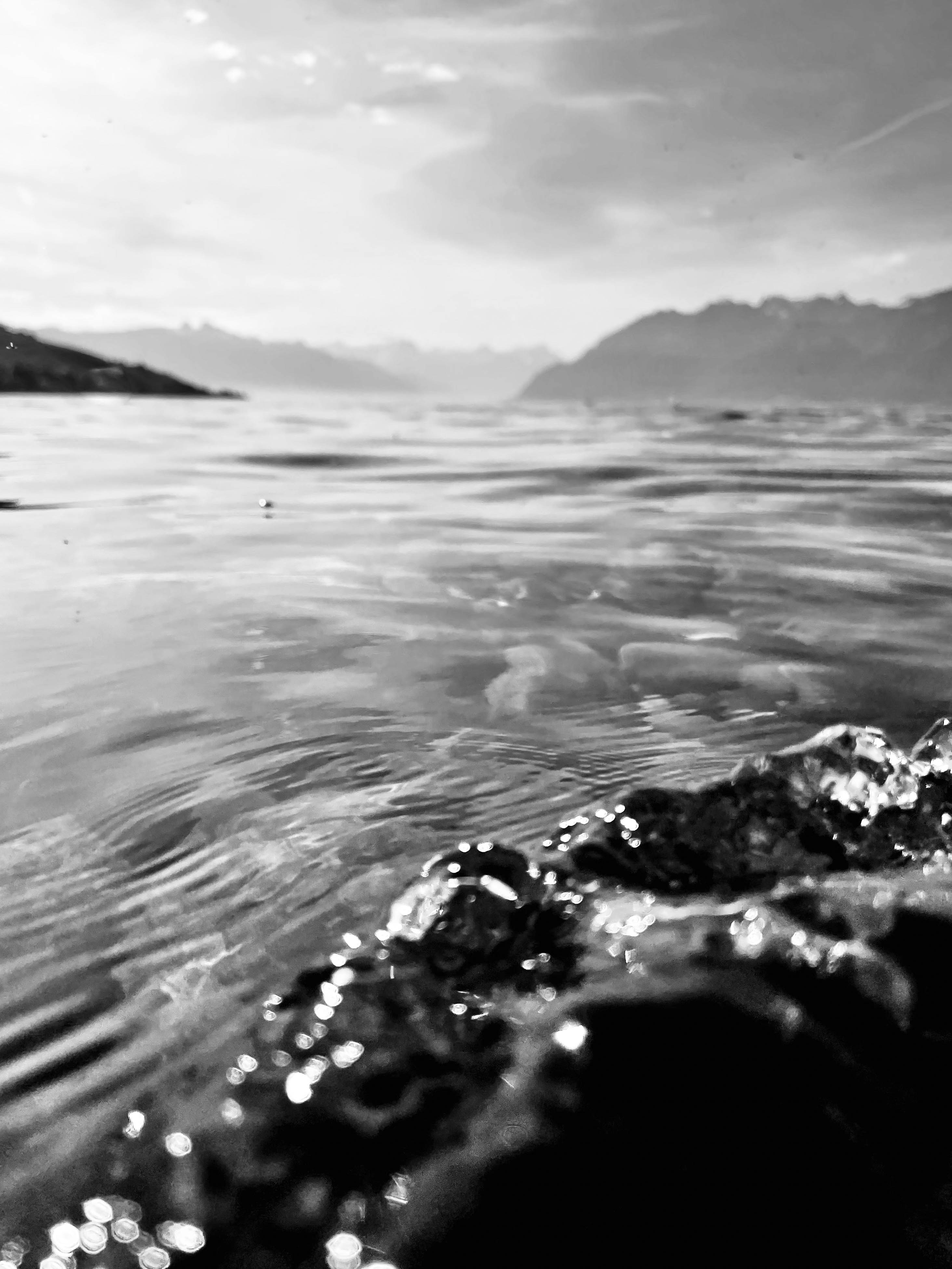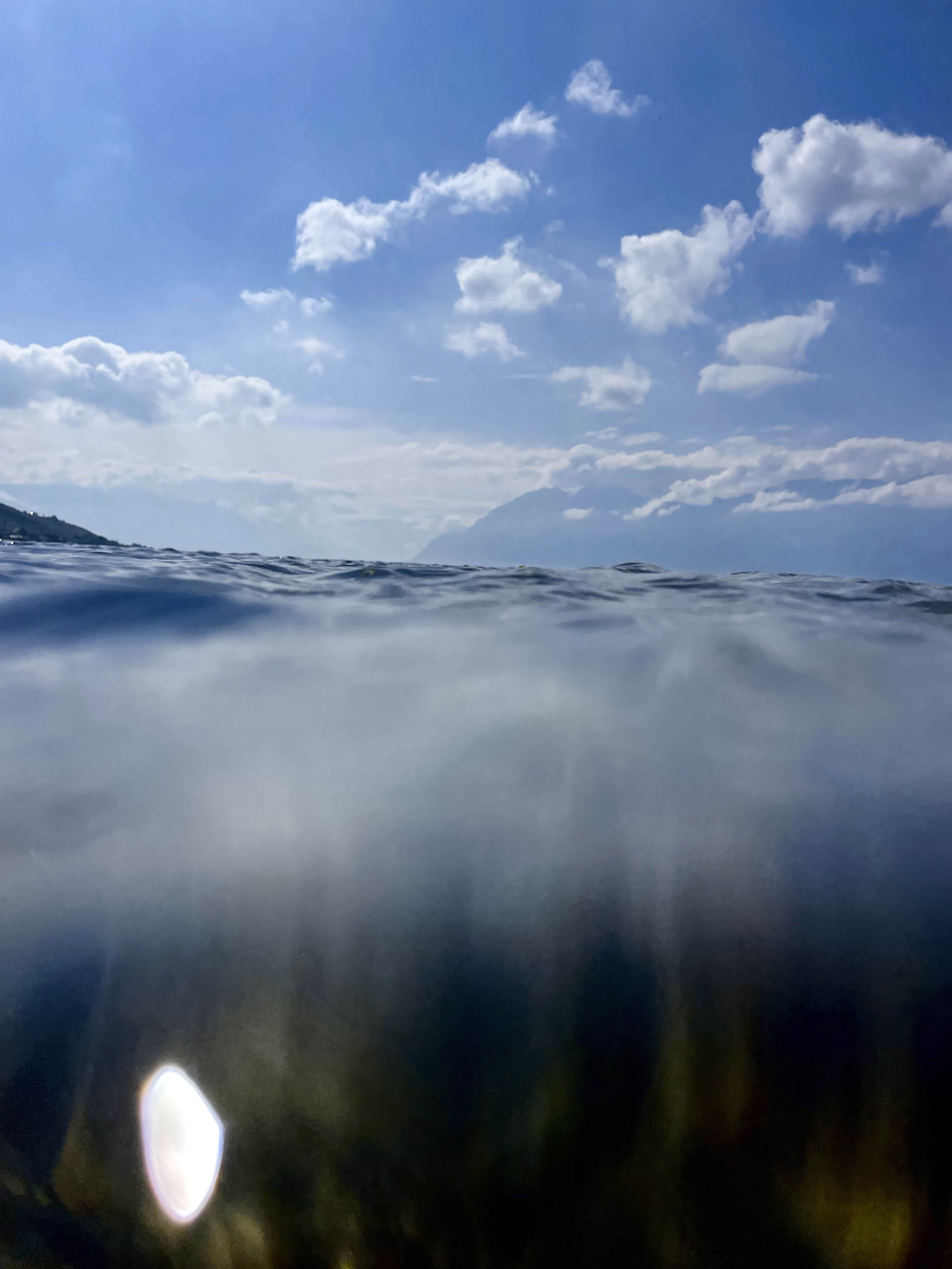 Je me retourne et j’observe, un petit moment suspendu de silence. Cette vision les yeux à 3 centimètres de l’horizon. Je suis au milieu du lac, je veux dire verticalement, moitié lac, moitié ciel.