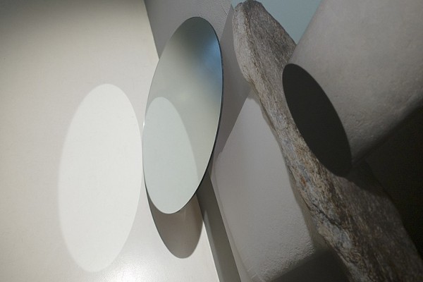 - Allusion d’espace est un miroir gris incliné (vitre peinte), qui nous rappelle les espaces présents comme un rétroviseur ou un filtre additionnel qui nous fait passer des trois aux deux dimensions.